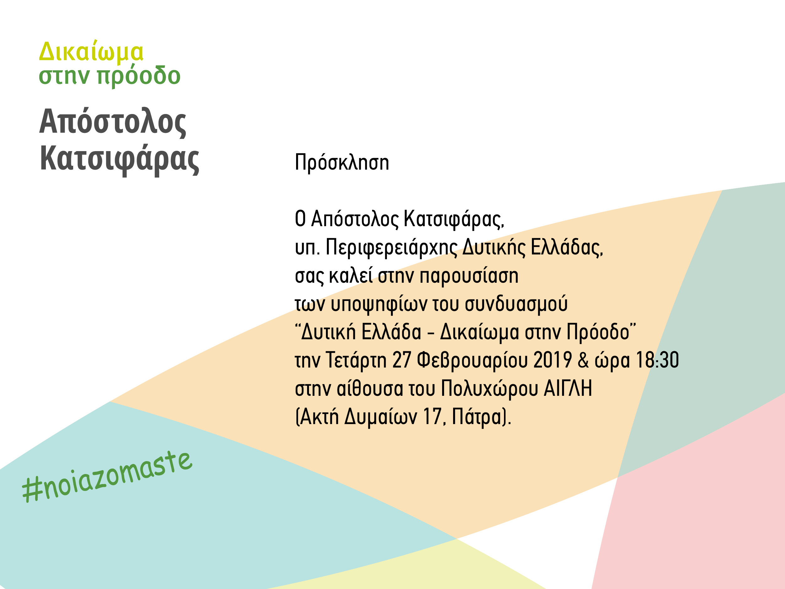 Το απόγευμα της ερχόμενης Τετάρτης 27 Φεβρουαρίου 2019, στις 6.30 μ.μ., στην αίθουσα του πολυχώρου «Αίγλη», στην Ακτή Δυμαίων 17 στην Πάτρα (Veso Mare), ο Περιφερειάρχης Δυτικής Ελλάδος Απόστολος Κατσιφάρας θ’ ανακοινώσει τους υποψηφίους περιφερειακούς συμβούλους του συνδυασμού του «Δυτική Ελλάδα-Δικαίωμα στην Πρόοδο» στην Περιφερειακή Ενότητα Αχαΐας